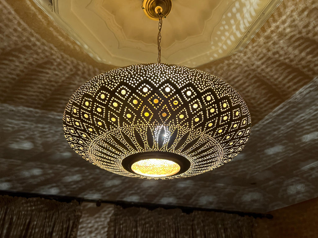 This exquisite Moroccan pendant light is crafted from premium quality pure brass and is 100% hand-engraved. It casts stunning shadows on the ceiling while providing ample illumination, making it an ideal standalone light fixture for any room. Whether you're looking for unique bedroom lighting, a statement chandelier lighting piece, or an artistic Moroccan lamp for your living space, this ceiling lamp brings an elegant touch to your interior.